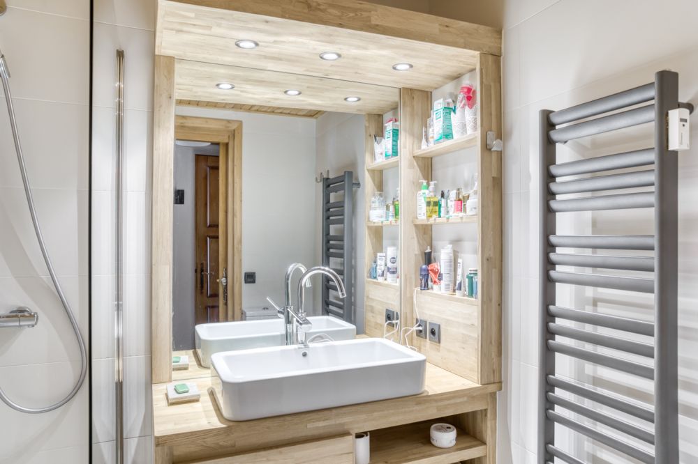 Deux salles de bain sont distribuées d’un côté et de l’autre, et les espaces bénéficient de belles ouvertures sur les vues environnantes.